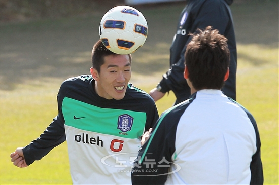 22일 오후 경기도 파주 NFC(축구대표팀 트레이닝센터)에서 온두라스와의 평가전을 앞두고 열린 축구 국가대표팀 소집훈련에서 김정우가 헤딩을 하고 있다.