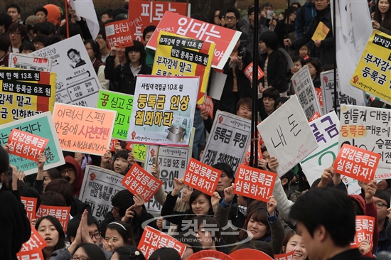 전국등록금네트워크와 한국대학생연합 주최로 2일 오후 서울 대학로 마로니에 공원에서 열린 정부의 '반값 등록금' 공약 이행을 촉구하는 집회에 참가한 대학생들이 구호를 외치고 있다.