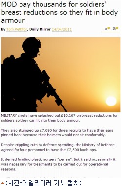 영국 국방부가 여군들의 가슴 축소술 성형 비용으로 1만167만 파운드(약 1천800만원)를 사용한 것으로 알려져 논란이 일고 있다.