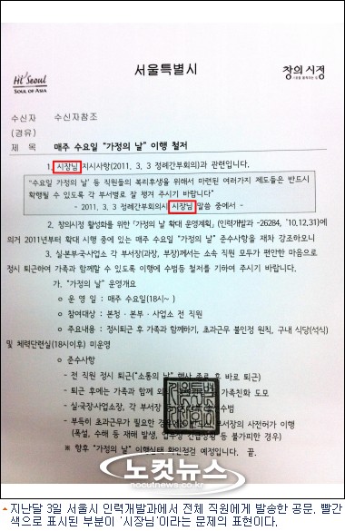 16일 서울시 시민소통담당관실에서 전체 직원들을 대상으로 발송한 '서울시 문턱을 낮추고 삶의 질을 높여주는 시민과의 소통강화계획'이라는 제목의 문서를 보면, '시장님'이라는 표현이 무려 10회나 등장한다.