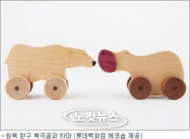 지구 온난화와 밀렵으로 인해 멸종 위기에 놓인 북극곰과 하마를 원목 나무로 재현한 이 완구는 화학색소를 전혀 사용하지 않고 친환경으로 제조해 아토피 등 피부 질환을 앓고 있는 아이에게도 안전한 장난감이다.