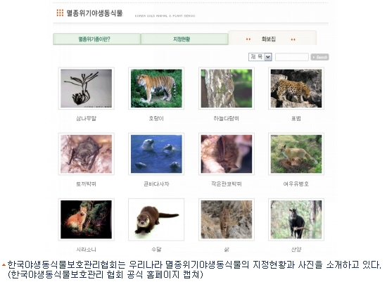 '멸종위기동물'에 대한 관심이 단순히 자국 실정에 국한되어야 할 필요는 없지만, 우리나라 멸종위기동물인 늑대(1급), 사향노루(1급), 산양(1급), 담비(2급), 물개(2급), 삵(2급) 등에 대한 상품화는 잘 되지 않고 있다는 점은 아쉬운 부분이다. 우리나라 멸종위기동식물은 총 221개 종에 달한다.