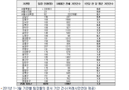 25개 자치구의 팀장들이 생산한 문서도 한 달 평균 1.3건에 불과했다.
