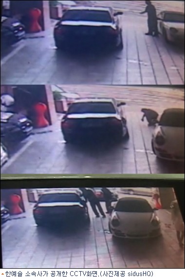 공개된 화면에는 한 남자가 주차장 입구에 서있다가 한예슬의 흰색 포르쉐 차랑에 엉덩이를 부딪쳤다. 이후 바닥에 주저앉았던 피해자는 엉덩이 부분을 잡은 채 차량 쪽으로 다가서다가 뒤늦게 나온 경비원과 이야기를 나누고 있는 모습이다.