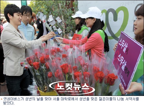 진정한 어른이 되는 성년의 날. 기념일을 즐기려는 청년들에겐 값비싼 향수와 꽃을 선물하며 즐기는 날로 인식 돼 있기도 하다. 자칫 상업적으로 흐를 수 있는 성년의 날을 의미 있게 보내기 위해 기독구호단체 굿네이버스(회장 이일하)가 16일 거리캠페인을 열었다.