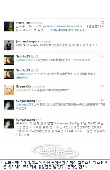 엠넷 ‘슈퍼스타K2’ 출신 김지수가 데뷔 앨범을 발매하자마자 허각, 장재인, 김소정 등 ‘슈퍼스타K2’ 멤버들의 응원이 이어지고 있어 눈길을 끈다.