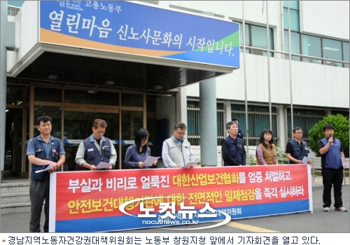 민노총경남지역본부와 마산창원거제산재추방운동연합 등으로 구성된 경남지역노동자건강권대책위원회는 1일 노동부 창원지청 앞에서 기자회견을 열고 "부실과 비리로 얼룩진 대한산업보건협회를 엄중 처벌하라"고 촉구했다.