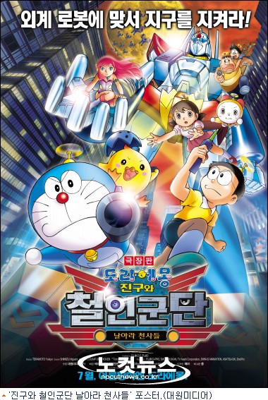 극장판 도라에몽 시리즈의 31번째 작품 '극장판 도라에몽:진구와 철인군단 날아라 천사들'이 7월 28일 국내 개봉을 확정했다. 마법세계, 공룡시대, 바닷속 모험에 이어 이번엔 지구의 운명을 걸고 외계 로봇과 대결을 펼친다.