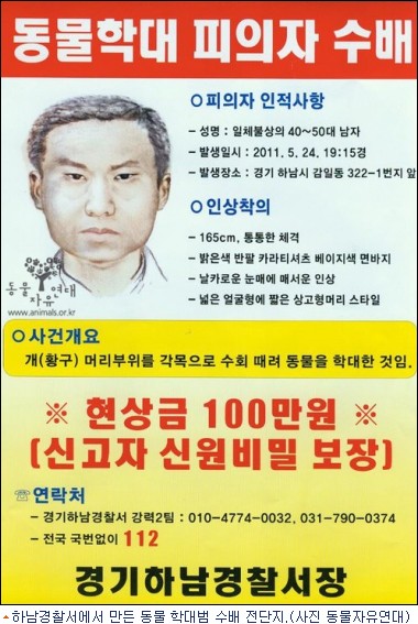 이에 ‘동물농장’ 제작진은 학대범을 공개수배했다. 최면수사를 바탕으로 만들어진 학대범의 몽타주는 40대 후반에서 50대 초반의 나이대, 165cm 정도의 키에 통통한 체구, 그리고 숱 없는 머리.