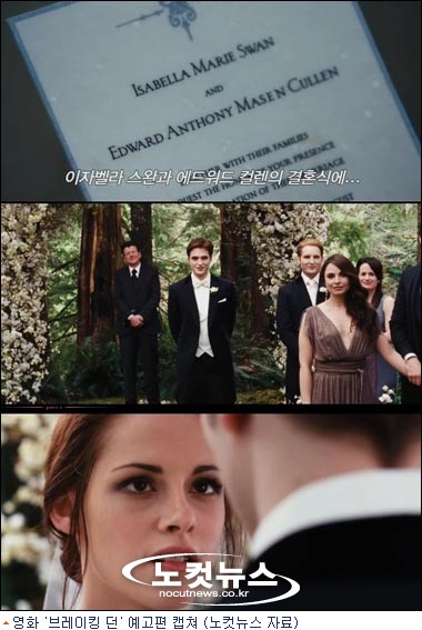 '트와일라잇' 시리즈의 네 번째 '브레이킹 던 part1'이 12월 개봉을 앞두고, 벨라와 에드워드의 결혼식을 담은 티저 예고편을 공개해 네티즌들의 관심을 끌었다.