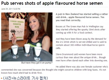 29일 영국 매체 뉴스라이트 등 외신들은 뉴질랜드 웰링턴 지역 술집 '그린맨'에서 사과맛 말 정액을 25뉴질랜드달러(약 2만2천원)에 판매하고 있다고 전했다.