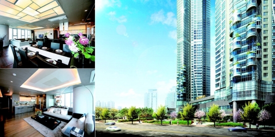 저층부(4층~15층)는 주상복합 최초로 외부 공간에 테라스를 설치해 호텔 같은 분위기를 연출하고 최고급 마감재로 시공했다. 실내 디자인도 유명 패션 디자이너인 이상봉 씨가 직접 참여했다.