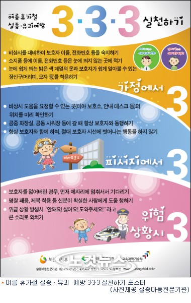 이에 보건복지부위탁 실종아동전문기관(소장 정원만)은 교육과학기술부(장관 이주호)와 함께 여름 휴가철을 맞이하여 ‘여름 휴가철 실종·유괴 예방 3·3·3 실천하기’ 포스터를 제작하여 7월말까지 전국의 5,858개 초등학교에 배포한다고 밝혔다.