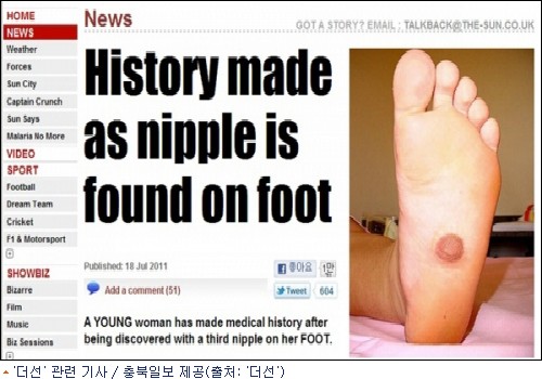 영국 일간지 '더선(The Sun)'은 18일 "과학 저널 '더마톨로지(dermatology·피부과학) 온라인'에 발바닥에 젖꼭지가 있는 사례가 보고됐다"며 "22세 여성 환자의 왼쪽 발바닥에서 지름 4㎝ 크기의 유두가 발견됐다"고 소개했다.