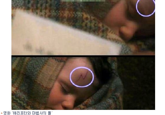 지난 2001년 개봉작인 이 영화에서 아기 시절 해리의 모습이 나오는데 처음에는 번개모양의 흉터가 보이지 않다가 나중에야 해리의 이마에 흉터가 있는 것이 보인다.