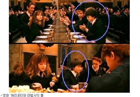 이뿐만이 아니다. 호그와트 마법학교에 가게 된 해리. 헤르미온느, 론 등 친구들과 식탁에 앉아서 식사를 하는데 화면이 바뀌자 갑자기 해리가 건너편 식탁에 넘어가 앉아있다.