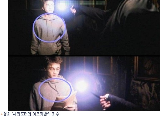 한밤중 호그와트 비밀지도를 들고 확인하러 나온 해리가 입고 있는 후드티의 끈이 화면이 바뀌자 순식간에 다른 모양으로 변해 있다.