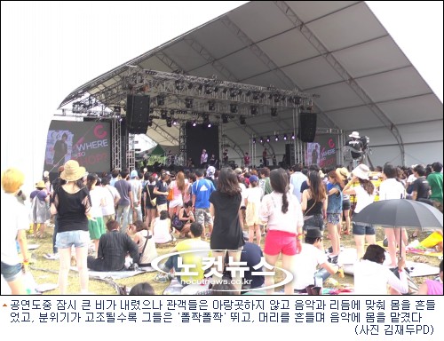 공연도중 잠시 큰 비가 내렸으나 관객들은 아랑곳하지 않고 음악과 리듬에 맞춰 몸을 흔들었고, 분위기가 고조될수록 그들은 '폴짝폴짝' 뛰고, 머리를 흔들며 음악에 몸을 맡겼다.
