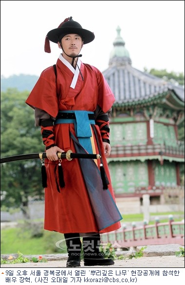 장혁은 함께 호흡을 맞추는 배우 한석규, 신세경과 함께 9일 오후 서울 종로구 경복궁 내 수정전에서 열린 SBS 새수목드라마 ‘뿌리깊은 나무’(극본 김영현· 박상연, 연출 장태유) 현장공개 및 기자간담회에 참석했다.