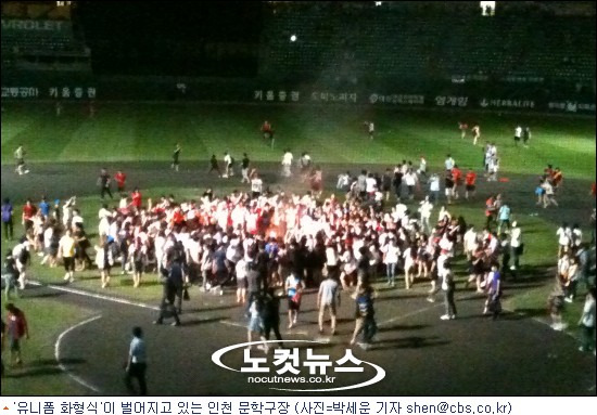 하지만 이 과정에서 야구장의 잔디가 손상되는 있어서는 안될 일이 벌어졌다. 불은 인천 지역 소방관이 출동한 뒤에야 진압됐다. 이후 관중들이 하나둘씩 그라운드를 빠져나가면서 상황이 일단락됐다.