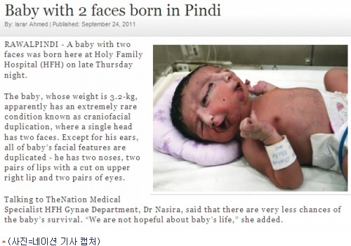 파키스탄에서 머리 하나에 얼굴이 둘인 아기가 태어나 한바탕 소동이 일었다고 24일 파키스탄 매체 네이션 등 외신들이 전했다.