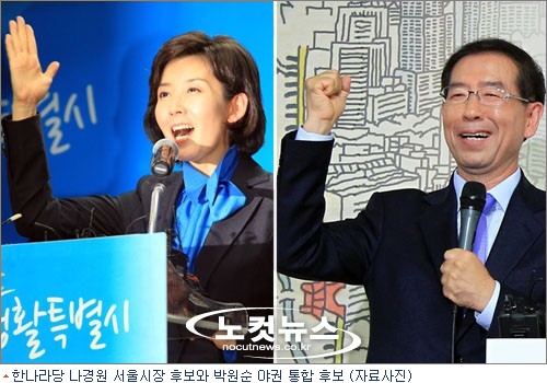 나경원 후보가 여당인 한나라당과 보수단체들의 전폭적인 지지를 받고 있는 반면 박원순 후보가 아직 민주당 당원의 마음을 움직이지 못하고 있기 때문이다.