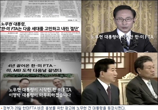 전날 지상파 방송을 탄 한미FTA 비준 광고는 '노무현 대통령이 시작한 한·미FTA를 이명박 대통령이 마무리하겠다'는 자막과 함께 노 전 대통령의 모습과 음성으로 시작했다. 또 광고는 한미FTA관련 노 전 대통령의 발언을 실은 언론보도도 담고 있다.