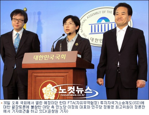 민주당 정동영 최고위원은 국회 브리핑에서 "ISD는 독소 중의 독소조항"이라며 "오늘 끝장토론을 앞두고 당정청이 29일 회동을 통해 31일까지 강행처리하겠다는 방침을 정한 것은 토론이 진지하고 성의있게 이뤄질 수 있을지 의문을 들게 한다"고 말했다.[BestNocut_R]