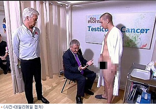 지난 1일 영국 ITV1 아침 생방송 프로그램 '디스 모닝' 중 젊은 나체 남성 모델이 흰 가운 하나만 걸치고 나와 고환암 전문의에게 고환 검사를 받았다.