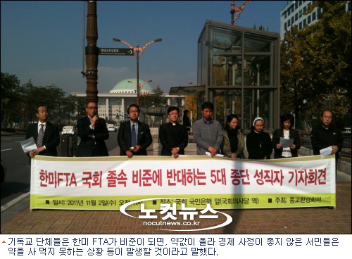 기독교 공대위는 특히 "한미FTA가 국민건강보험제도를 비롯한 사회 공공성을 약화시켜 국민들에게 고통을 안겨줄 것"이라고 주장했다.