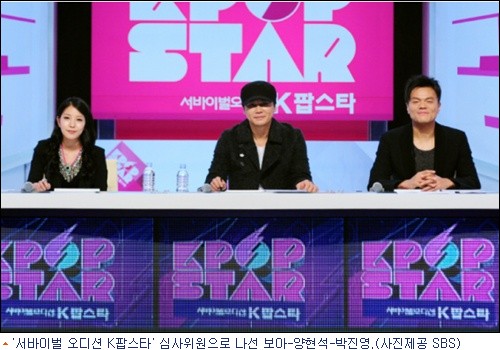 한편 ‘K팝 스타’는 국내 최고의 스타 제조 시스템을 갖춘 SM, YG, JYP 3곳의 기획사가 방송 최초로 한 자리에 모여 세계시장을 공략할 차세대 K팝 스타를 발굴하는 서바이벌 프로그램. 특히 K팝 열풍의 중심에서 맹활약하고 있는 양현석과 박진영, 보아가 함께 심사위원으로 나서 기대를 모으고 있다.