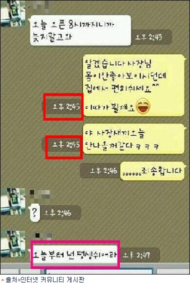 당황한 아르바이트생은 이 사실을 깨닫고 재빨리 “죄송합니다”라고 문자를 재전송했지만 물은 이미 엎지러진 후. 사장은 “오늘부터 넌 평생 쉬어라”며 짧지만 강한 한 마디를 남겼다.
