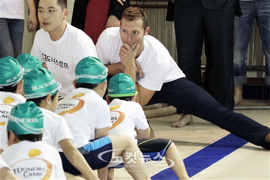 한국을 첫 방문한 세계적인 수영 스타 이언 소프가 15일 오후 서울 서대문구 연세대학교 수영장에서 열린 '이언 소프와 함께하는 수영놀이교실'에서 작은사랑 서울지역 아동센터 학생들과 함께 몸을 풀고 있다. 이번 행사는 CJ 도너스 캠프와 블랙모어스가 공동 주관하고 연세대 스포츠레더학과가 후원했다.