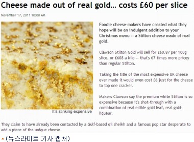 롱 클로슨 유제품 제조사에서 식용 금가루가 잔뜩 들어간 클로슨 스틸턴 치즈를 100g 한조각에 60.87파운드(약 11만원)에 팔고 있다는 것.