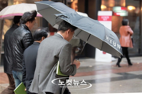 비가 그친 뒤 강한 바람이 불고 있는 23일 오전 서울 양천구 목동 현대백화점 인근에서 직장인들이 출근길에 바람을 우산으로 막으며 걸어가고 있다. 기상청에 따르면 이날 저녁부터 기온이 10도 이상 크게 떨어져 24일 아침에는 전국의 기온이 영하권에 머무를 전망이다. 일부 지역에는 한파주의보가 예고된다.
