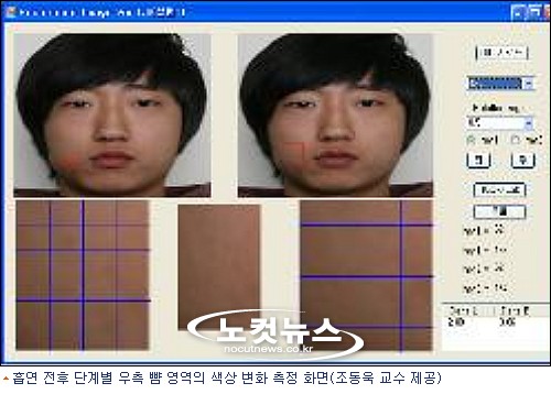 충북도립대학교 생체신호분석연구실 조동욱(53, 전자통신전공) 교수는 직접 흡연시 폐에 미치는 영향을 영상처리 및 분석을 통한 얼굴색 변화 실험으로 이 같은 결과를 얻었다고 5일 밝혔다.