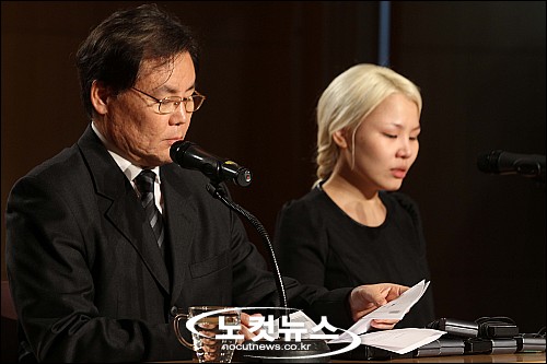 가수 알리가 신곡 '나영이' 가사 논란과 관련 16일 오후 서울 상명대학교 콘서트홀에서 기자회견 가진 가운데 아버지가 알리도 성폭행 피해자임을 밝히며 사과를 하고 있다.