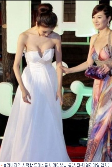 사진촬영 후 나가려던 쑨의 드레스 자락을 진행자 팡링이 뒤에서 밟으면서 살구색 브라가 다 보일 정도로 드레스가 내려가 버린 것.