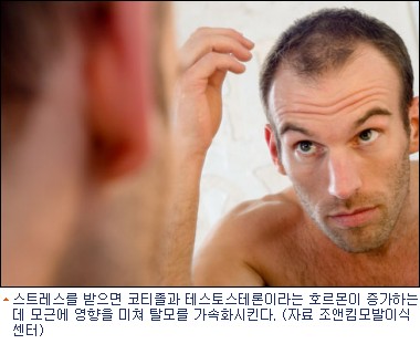스트레스를 받으면 코티졸과 테스토스테론이라는 호르몬이 증가하는데 이러한 호르몬은 모근에 영향을 미쳐 탈모를 가속화시킨다.