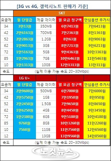 ◈ 속시원한 속도 'LTE요금제' vs 저렴·안심 '3G요금제'삼성전자 '갤럭시 노트'를 이동통신 3사가 모두 판매를 시작했다. 갤럭시 노트의 출고가는 통신 3사 모두 99만9900 원으로, KT에서 판매하는 갤럭시노트와 SK텔레콤의 갤럭시노트는 하드웨어 사양이 동일한 제품이다.