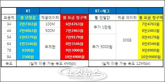 ◈ KT vs SKT·LG U+, "월 부담액 차이 최대 3만원↑"요금제별 사용자를 기준으로 살펴보면, 34요금제와 42(44)요금제는 월요금 청구액이 큰 차이가 없다. 가장 중요한 것은 사용자의 월 데이터 사용량이다. 적은 양을 빠른 속도로 즐기고 싶다면 LTE요금제를, 월 1GB 이상을 사용한다면 KT+에그 옵션이 적격이다.
