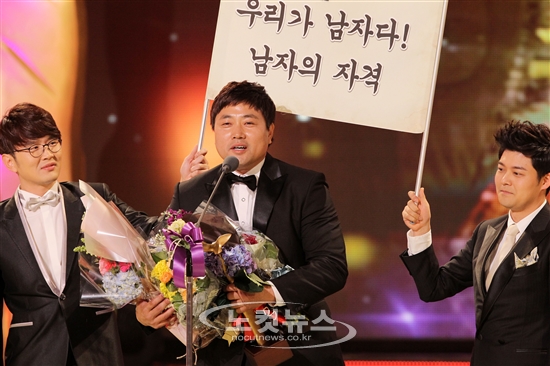 24일 밤 서울 여의도 KBS홀에서 '2011 KBS 연예대상' 시상식이 열린 가운데 쇼오락MC부문 신인상을 수상한 양준혁이 수상소감을 밝히고 있다.