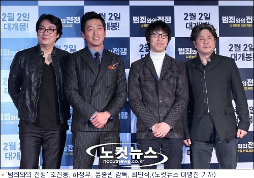 28일 오전 서울 동대문메가박스에서 열린 '범죄와의 전쟁' 제작보고회에 참석한 최민식, 하정우, 조진웅 등 세 배우는 나이를 떠나 동료 배우로서 서로를 극찬했다.