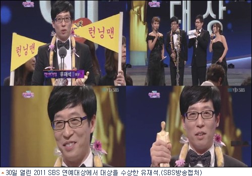 이날 ‘강심장’의 이승기, ‘힐링캠프’ ‘스타주니어쇼 자기야’의 이경규, ‘정글의 법칙’ 김병만과 함께 후보에 오른 유재석은 ‘일요일이 좋다-런닝맨’으로 2년 만에 SBS에서 대상을 수상했다.