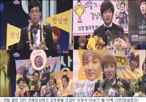이날 토크쇼 부분 우수상을 공동 수상한 이특은 “언제나 따끔한 충고를 보내주시던 강호동 선배님! 선배님이 계실 곳은 그곳이 아니라 여깁니다. 어서 오십시오”라고 복귀를 바랐고, 붐 역시 강호동의 사진을 넣은 플랜카드를 들고 ‘붐광댄스’를 췄다.