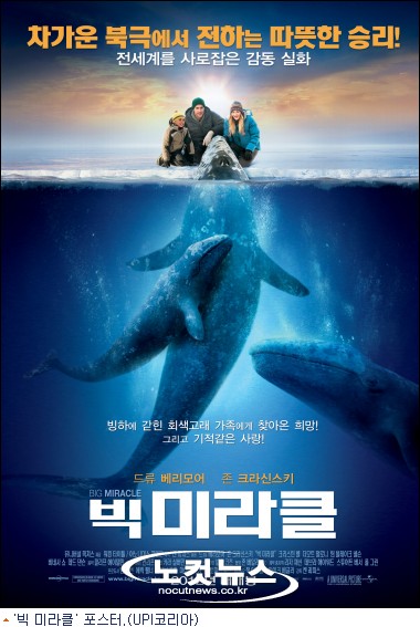 '빅 미라클' 포스터는 북극의 푸른 바다 속 거대한 회색고래가 빙하의 작은 구멍으로 간신히 고개를 내밀고 인간들을 바라보고 있는 모습이 눈에 띈다. 또 전세계가 하나로 뭉쳐 고래를 구하기 위한 작업 과정을 담은 예고편은 실화가 주는 감동을 느끼기에 충분했다.