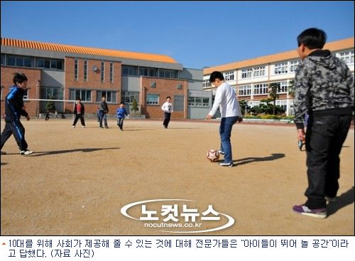 ◈ 생활 속의 '분출구' 사회가 마련해줘야그렇다면, 고통 받고 있는 10대를 위해 사회가 제공해 줄 수 있는 건 무엇일까. 전문가들은 "아이들이 뛰어 놀 공간 마련이 시급하다"고 입을 모은다.