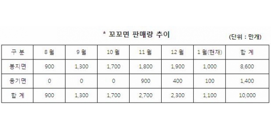 꼬꼬면 1억개를 길이(꼬꼬면 한 개 20cm)로 환산하면 백두산(높이 2.75km)을 7천개 이상 쌓은 높이와 같다. 또 물과 함께 끓이면(물 500ml + 꼬꼬면 한 개 120g) 코엑스 아쿠아리움 수족관(2,300톤)을 26번 이상 채울 수 있는 양이다.