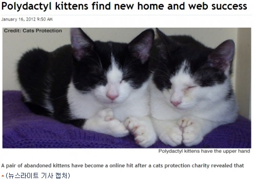 영국 햄프셔 고스포트 지역 고양이 보호 자선단체에 온 다지증 새끼 고양이 네드와 프레드는 다른 고양이들보다 각각 8개, 10개 더 많은 발가락으로 주목을 받았다.