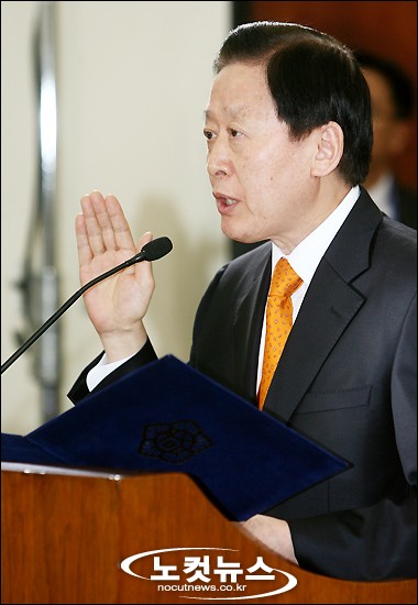 김하중 통일부장관 후보자가 10일 오전 서울 여의도 국회의사당 통일외교통상위원회에서 열린 인사청문회에서 선서를 하고 있다.